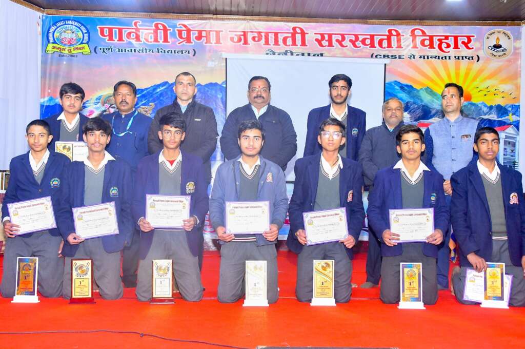 नैनीताल ( nainilive.com)- नगर के दुर्गापुर क्षेत्र में स्थित पार्वती प्रेमा जगाती सरस्वती विहार में आज दिनांक 18 दिसंबर 2025 को विद्यालय प्रांगण में भव्य पुरस्कार वितरण समारोह का आयोजन किया गया। इस कार्यक्रम में वर्ष भर में हुए शैक्षिक, शारीरिक, सांस्कृतिक एवं खेलकूद गतिविधियों में उत्कृष्ट प्रदर्शन करने वाले विद्यार्थियों को सम्मानित किया गया । कार्यक्रम की अध्यक्षता विद्यालय के प्रधानाचार्य डॉ. सूर्य प्रकाश जी ने की।