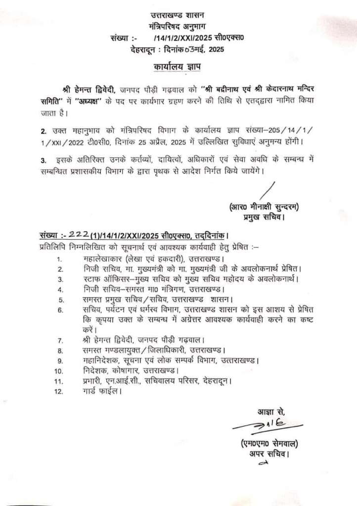 भाजपा नेता हेमन्त द्विवेदी किए गए श्री बदरीनाथ एवं श्री केदारनाथ मन्दिर समिति में अध्यक्ष नियुक्त