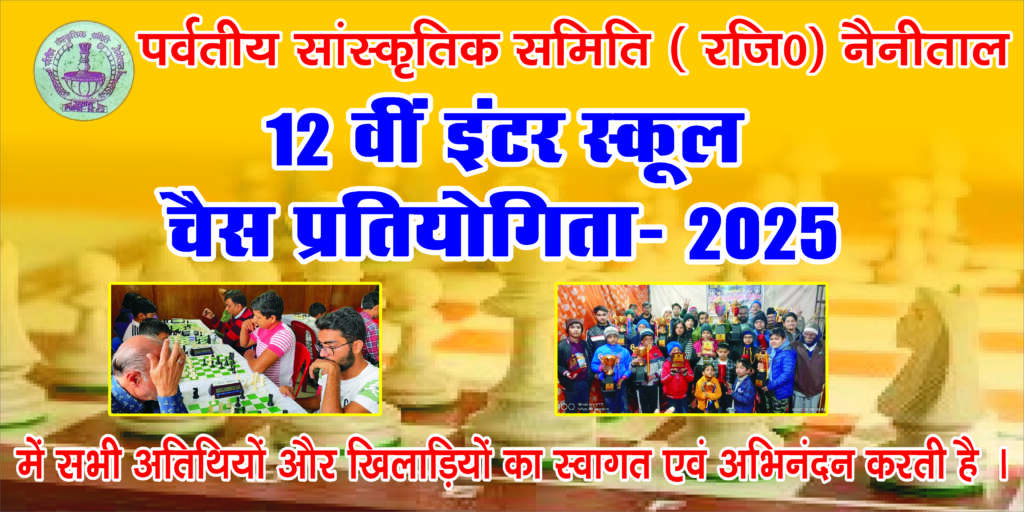 12 वी इंटर स्कूल शतरंज प्रतियोगिता गोवर्धन हाल में पर्वतीय संस्कृतिक समिति के तत्वाधान में आयोजित स्कूलों बच्चों के मध्य 24 अगस्त को शहर के गोवर्धन हाल में क्वींस स्कूल हल्द्वानी, जी डी गोयनका नौकुचियाताल, शेरवुड कॉलेज नैनीताल, बिड़ला विद्या मंदिर नैनीताल, सेंट मैरी नैनीताल, स्प्रिंग डेल्स अल्मोड़ा, विशन वैली काशीपुर, ग्रीन वैली, सिंथिया हल्द्वानी, समर स्टडी हॉल काशीपुर, लॉन्ग व्यू नैनीताल, आर्यमान बिड़ला, सेंट जोज़फ स्कूल नैनीताल, लेक्स भीमताल, बीरशिवा हल्द्वानी, होली विस्डम, आनंदा अकेडमी हल्द्वानी, सनवाल स्कूल नैनीताल के 120खिलाड़ियों के मध्य खेले जाएंगे। प्रतियोगिता की सभी तैयारी पूरी हो गई है।