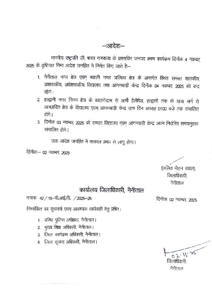 4 नवंबर को राष्ट्रपति के नैनीताल से वापस जाने के कार्यक्रम के दौरान उनके रास्ते में पड़ने वाले काठगोदाम से आर्मी हेलीपेड हल्द्वानी में पड़ने वाले स्कूलों और आंगनबाड़ी केंद्रों को दोपहर 1 बजे तक छुट्टी करनी होगी। जिलाधिकारी नैनीताल ललित मोहन रयाल ने इसका बाकायदा लिखित आदेश जारी कर दिया है।