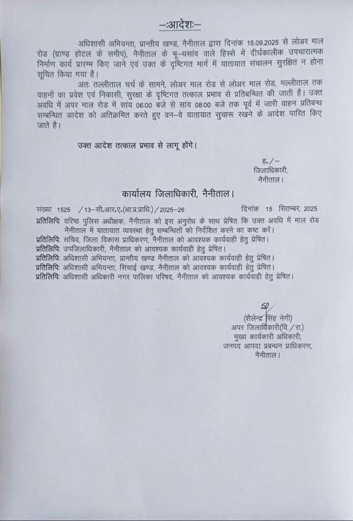नैनीताल ( nainilive.com )- नैनीताल, लोअर मालरोड में भू धंसाव वाले स्थान पर दीर्घकालिक उपचारात्मक निर्माण कार्य के दृष्टिगत दिनांक 15.09.2025 से लोअर मालरोड में अग्रिम आदेशों तक यातायात प्रतिबंधित किया गया है।