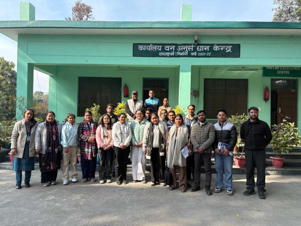 शैक्षणिक भ्रमण के द्वितीय चरण में शिक्षार्थियों को विभाग के सहायक प्राध्यापक डॉ. कृष्ण कुमार टम्टा, डॉ. नेहा तिवारी एवं डॉ. दीप्ति नेगी के मार्गदर्शन में वन अनुसंधान केंद्र, लालकुआँ का शैक्षणिक भ्रमण कराया गया। इस भ्रमण के दौरान शिक्षार्थियों को वानिकी एवं पर्यावरण विज्ञान से संबंधित व्यवहारिक ज्ञान प्रदान करने के उद्देश्य से पॉपलर के उन्नत क्लोन विकास तकनीक की प्रक्रिया, उसके महत्व एवं उपयोग पर विस्तार से जानकारी दी गयी साथ ही फाइकस गार्डन, हेल्थ गार्डन, औषधीय एवं सुगंधित पौधों का उद्यान, इंटरप्रिटेशन सेंटर तथा मियावाकी मॉडल का अवलोकन कराया गया। इस भ्रमण के लिए वन क्षेत्र अधिकारी (अनुसंधान) श्री नैन सिंह नेगी, श्री ज्योति प्रकाश एवं फॉरेस्टर श्रीमती सोनी का विशेष योगदान रहा।